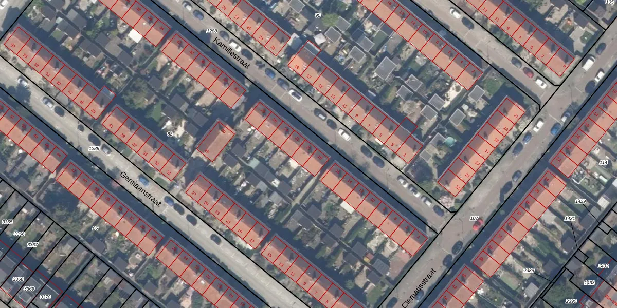 Het perceel waarop Kamillestraat 20 staat heeft een oppervlakte van 6743 m². Dit is een zeer groot perceel. De perceeloppervlakte wordt geregistreerd door het Kadaster. Gedetailleerde informatie over de maten van dit perceel kunt u vinden in het rapport Kadastrale kaart met maatvoering van Kamillestraat 20.