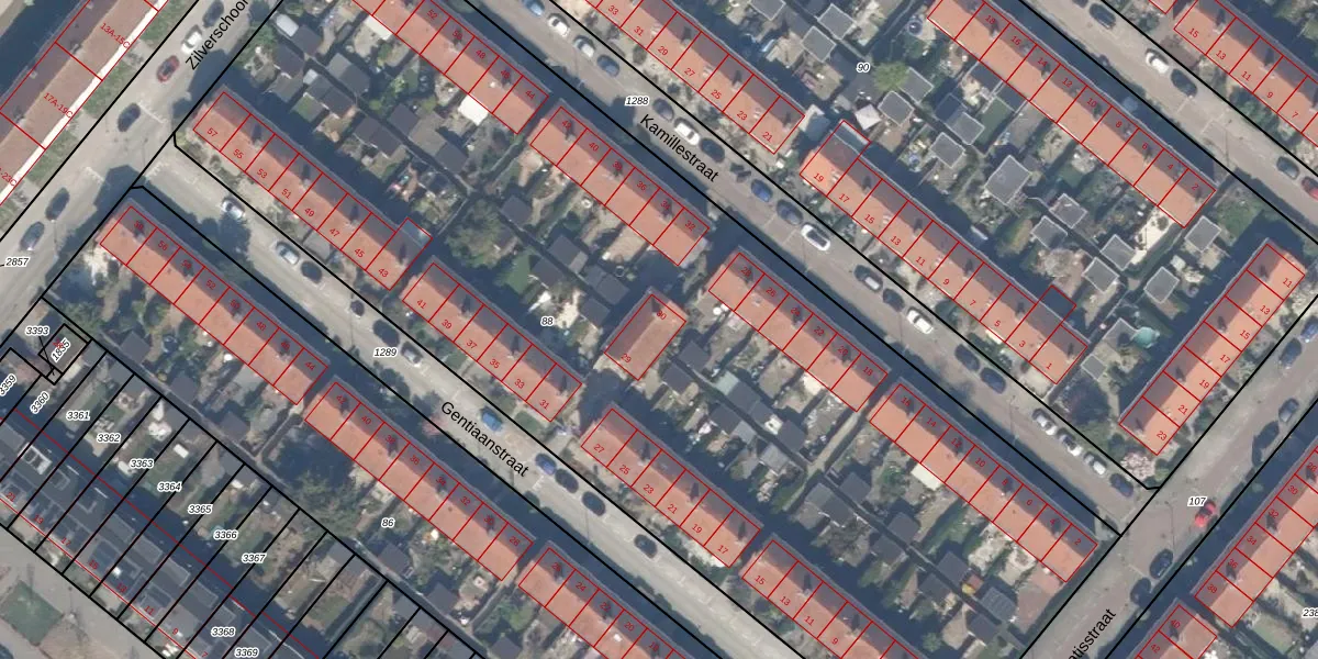 Het perceel waarop Kamillestraat 30 staat heeft een oppervlakte van 6743 m². Dit is een zeer groot perceel. De perceeloppervlakte wordt geregistreerd door het Kadaster. Gedetailleerde informatie over de maten van dit perceel kunt u vinden in het rapport Kadastrale kaart met maatvoering van Kamillestraat 30.