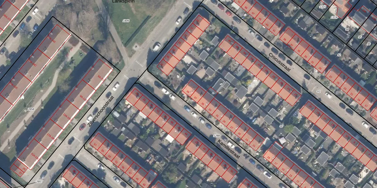 Het perceel waarop Kamillestraat 39 staat heeft een oppervlakte van 6746 m². Dit is een zeer groot perceel. De perceeloppervlakte wordt geregistreerd door het Kadaster. Gedetailleerde informatie over de maten van dit perceel kunt u vinden in het rapport Kadastrale kaart met maatvoering van Kamillestraat 39.
