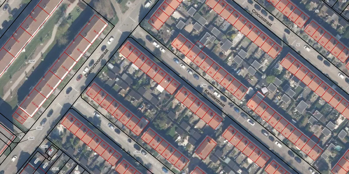 Het perceel waarop Kamillestraat 44 staat heeft een oppervlakte van 6743 m². Dit is een zeer groot perceel. De perceeloppervlakte wordt geregistreerd door het Kadaster. Gedetailleerde informatie over de maten van dit perceel kunt u vinden in het rapport Kadastrale kaart met maatvoering van Kamillestraat 44.