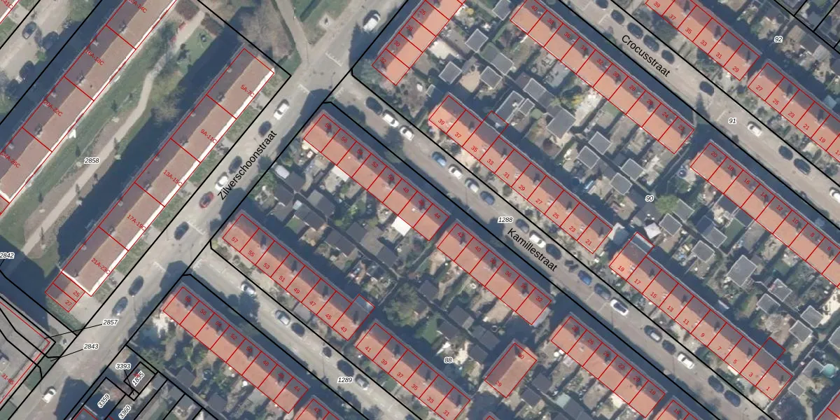 Het perceel waarop Kamillestraat 46 staat heeft een oppervlakte van 6743 m². Dit is een zeer groot perceel. De perceeloppervlakte wordt geregistreerd door het Kadaster. Gedetailleerde informatie over de maten van dit perceel kunt u vinden in het rapport Kadastrale kaart met maatvoering van Kamillestraat 46.