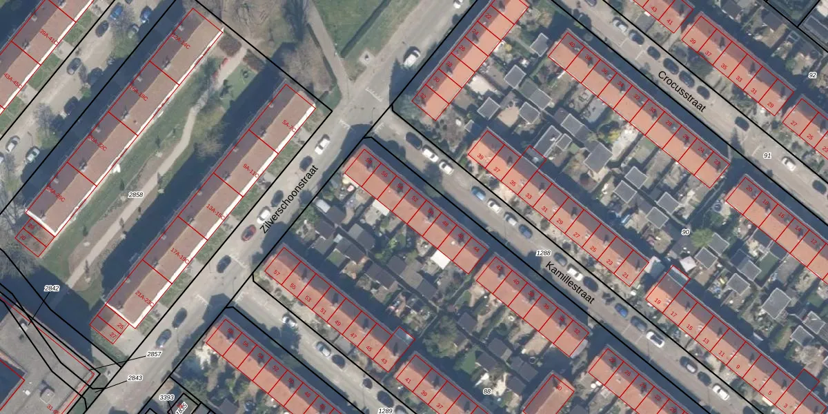 Het perceel waarop Kamillestraat 52 staat heeft een oppervlakte van 6743 m². Dit is een zeer groot perceel. De perceeloppervlakte wordt geregistreerd door het Kadaster. Gedetailleerde informatie over de maten van dit perceel kunt u vinden in het rapport Kadastrale kaart met maatvoering van Kamillestraat 52.