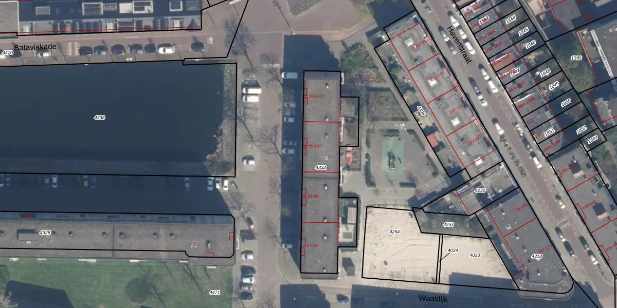 Het adres is gelegen op perceel 4332 in de sectie A en de kadastrale gemeente Delfshaven. De kadastrale aanduiding is aldus DHV00-A-4332. Het perceel is met 980 m² relatief groot. Het gemiddelde ligt in de kadastrale gemeente Delfshaven op 628,82 m². De grootste perceeloppervlakte in de kadastrale gemeente is 22,2 ha. De kleinste oppervlakte bedraagt 0 m². Op het perceel zijn 28 adressen aanwezig. In de Basisregistratie Kadaster (BRK) werden de grenzen van het perceel geregistreerd op 01-11-2007.