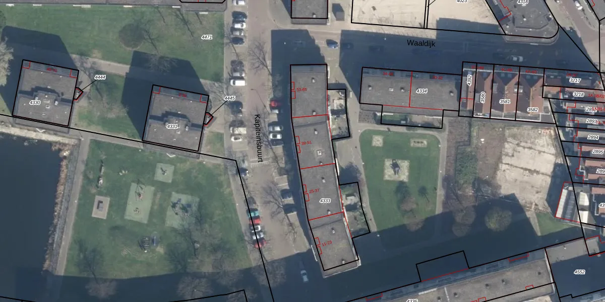 Kapiteinsbuurt 45 is gelegen op kadastraal perceel DHV00A4333. Deze kadastrale aanduiding is uniek en wordt gebruikt door het Kadaster om eigendomsrechten en andere zakelijke rechten vast te leggen. Het perceel maakt onderdeel uit van de kadastrale gemeente Delfshaven.