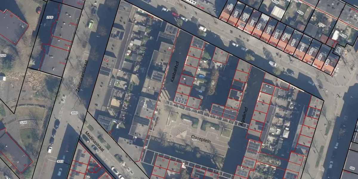 Het perceel waarop Kasbahhof 12 staat heeft een oppervlakte van 1,1 ha. Dit is een zeer groot perceel. De perceeloppervlakte wordt geregistreerd door het Kadaster. Gedetailleerde informatie over de maten van dit perceel kunt u vinden in het rapport Kadastrale kaart met maatvoering van Kasbahhof 12.