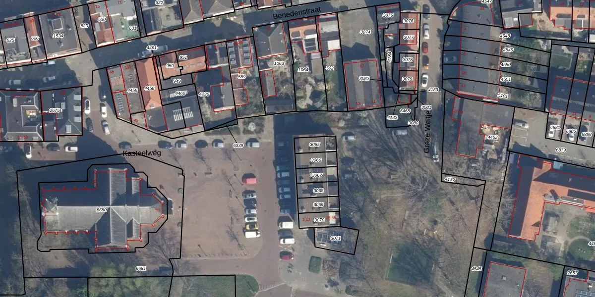 Het perceel waarop Kasteelweg 13 staat heeft een oppervlakte van 72 m². Dit is een klein perceel. De perceeloppervlakte wordt geregistreerd door het Kadaster. Gedetailleerde informatie over de maten van dit perceel kunt u vinden in het rapport Kadastrale kaart met maatvoering van Kasteelweg 13.