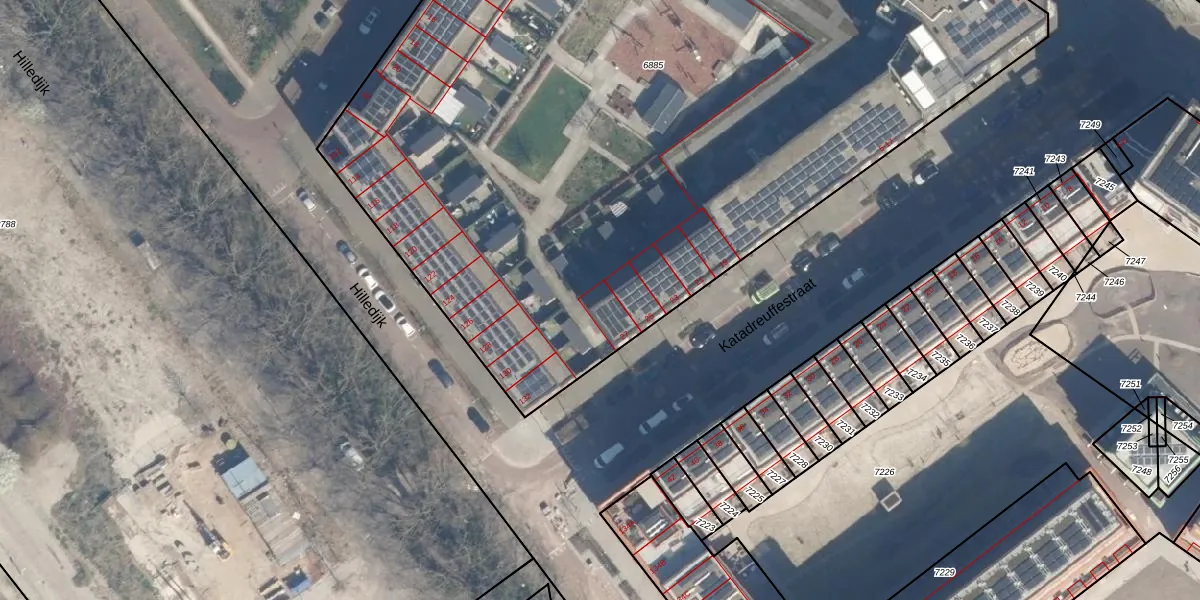 Het perceel waarop Katadreuffestraat 27 staat heeft een oppervlakte van 7150 m². Dit is een zeer groot perceel. De perceeloppervlakte wordt geregistreerd door het Kadaster. Gedetailleerde informatie over de maten van dit perceel kunt u vinden in het rapport Kadastrale kaart met maatvoering van Katadreuffestraat 27.