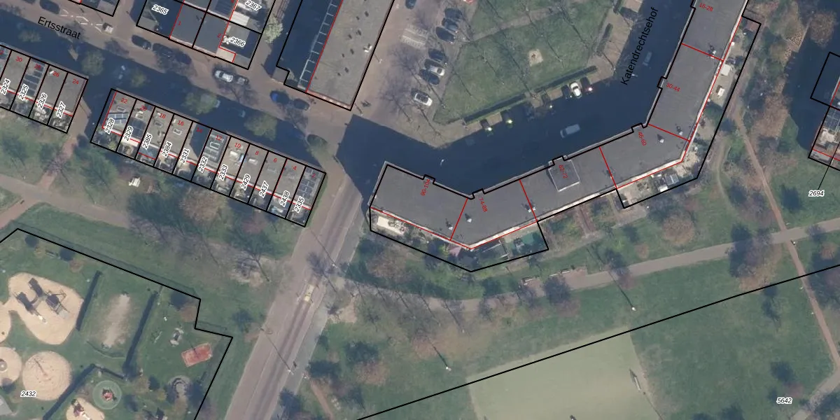 Het perceel waarop Katendrechtsehof 98 staat heeft een oppervlakte van 3084 m². Dit is een zeer groot perceel. De perceeloppervlakte wordt geregistreerd door het Kadaster. Gedetailleerde informatie over de maten van dit perceel kunt u vinden in het rapport Kadastrale kaart met maatvoering van Katendrechtsehof 98.
