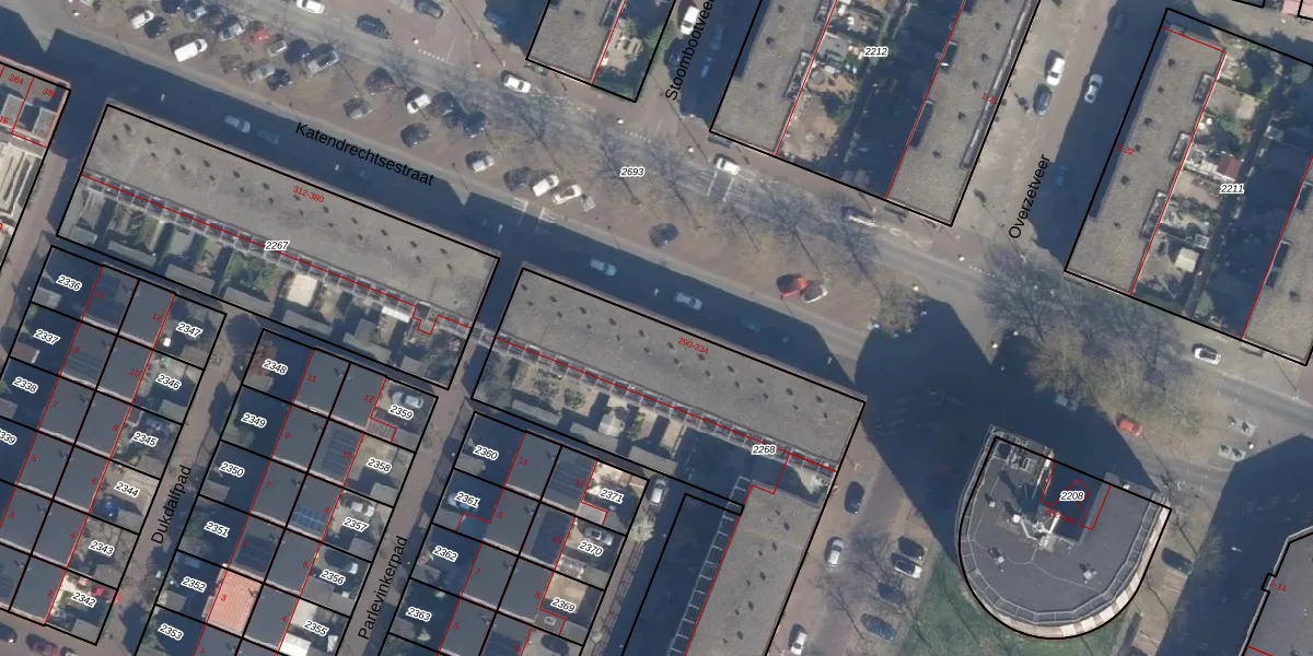 Het perceel waarop Katendrechtsestraat 302 staat heeft een oppervlakte van 2310 m². Dit is een zeer groot perceel. De perceeloppervlakte wordt geregistreerd door het Kadaster. Gedetailleerde informatie over de maten van dit perceel kunt u vinden in het rapport Kadastrale kaart met maatvoering van Katendrechtsestraat 302.