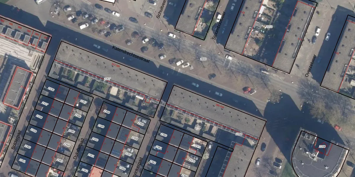 Het perceel waarop Katendrechtsestraat 310 staat heeft een oppervlakte van 2310 m². Dit is een zeer groot perceel. De perceeloppervlakte wordt geregistreerd door het Kadaster. Gedetailleerde informatie over de maten van dit perceel kunt u vinden in het rapport Kadastrale kaart met maatvoering van Katendrechtsestraat 310.