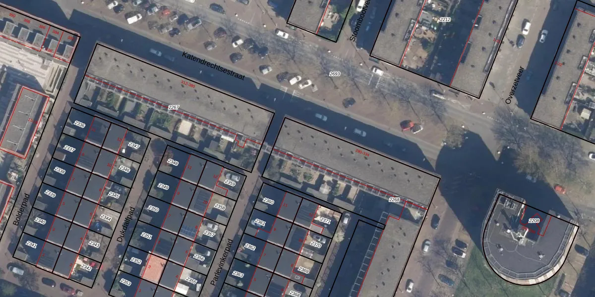 Het perceel waarop Katendrechtsestraat 332 staat heeft een oppervlakte van 2310 m². Dit is een zeer groot perceel. De perceeloppervlakte wordt geregistreerd door het Kadaster. Gedetailleerde informatie over de maten van dit perceel kunt u vinden in het rapport Kadastrale kaart met maatvoering van Katendrechtsestraat 332.