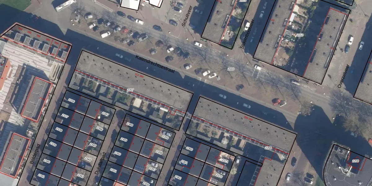 Het perceel waarop Katendrechtsestraat 350 staat heeft een oppervlakte van 1360 m². Dit is een zeer groot perceel. De perceeloppervlakte wordt geregistreerd door het Kadaster. Gedetailleerde informatie over de maten van dit perceel kunt u vinden in het rapport Kadastrale kaart met maatvoering van Katendrechtsestraat 350.