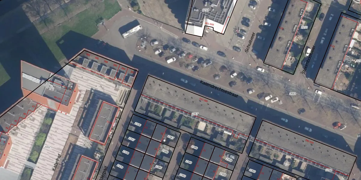 Katendrechtsestraat 374 is gelegen op kadastraal perceel RTD05P2267. Deze kadastrale aanduiding is uniek en wordt gebruikt door het Kadaster om eigendomsrechten en andere zakelijke rechten vast te leggen. Het perceel maakt onderdeel uit van de kadastrale gemeente Rotterdam.