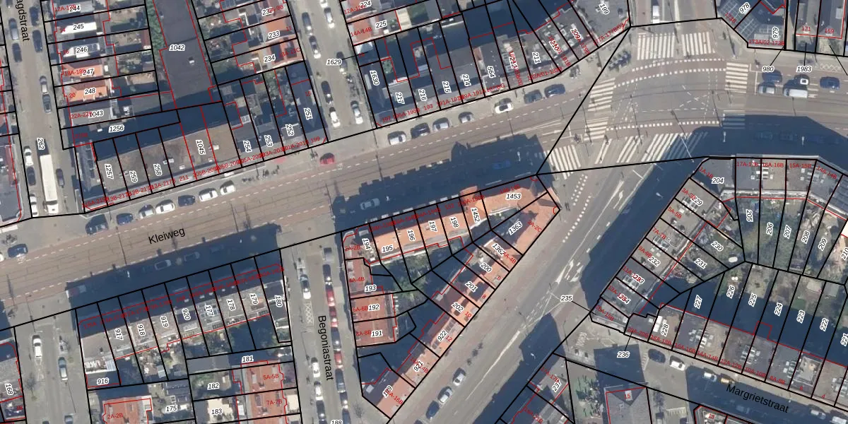 Kleiweg 154-B is gelegen op kadastraal perceel HLG03H197. Deze kadastrale aanduiding is uniek en wordt gebruikt door het Kadaster om eigendomsrechten en andere zakelijke rechten vast te leggen. Het perceel maakt onderdeel uit van de kadastrale gemeente Hillegersberg.