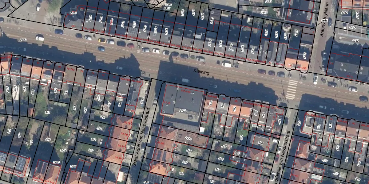 Het perceel waarop Kleiweg 64-A staat heeft een oppervlakte van 621 m². Dit is een groot perceel. De perceeloppervlakte wordt geregistreerd door het Kadaster. Gedetailleerde informatie over de maten van dit perceel kunt u vinden in het rapport Kadastrale kaart met maatvoering van Kleiweg 64-A.