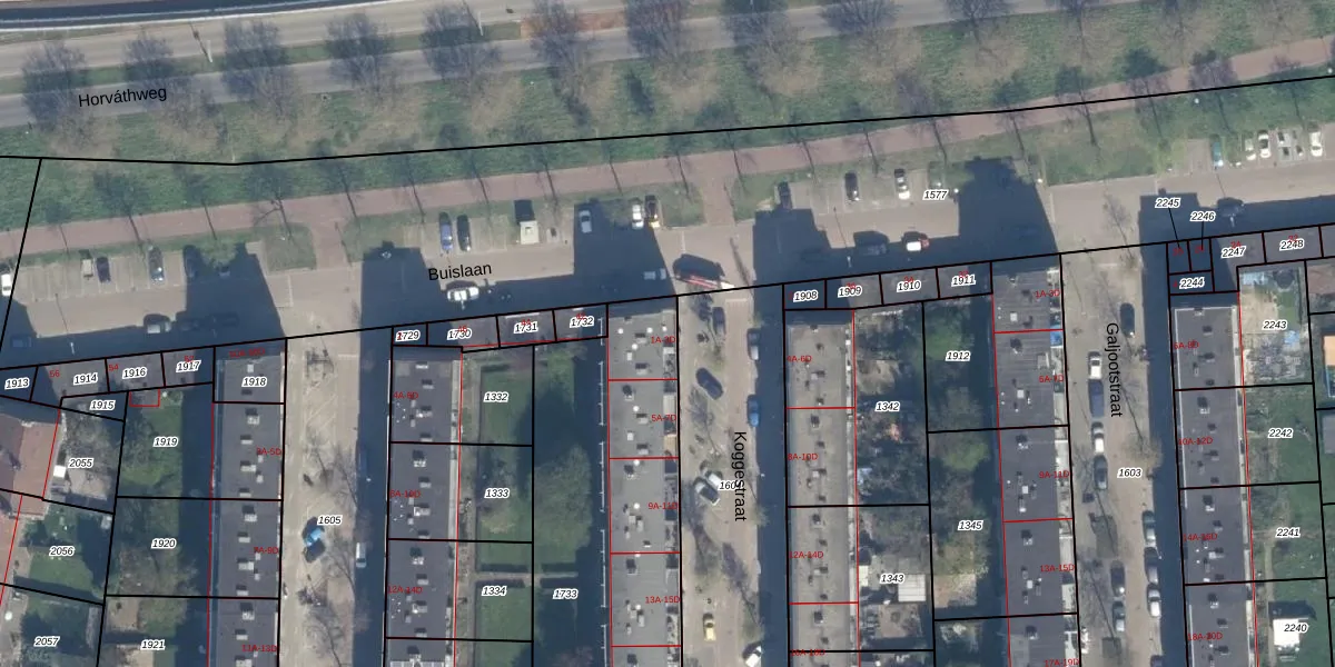 Het perceel waarop Koggestraat 1-A staat heeft een oppervlakte van 1721 m². Dit is een zeer groot perceel. De perceeloppervlakte wordt geregistreerd door het Kadaster. Gedetailleerde informatie over de maten van dit perceel kunt u vinden in het rapport Kadastrale kaart met maatvoering van Koggestraat 1-A.
