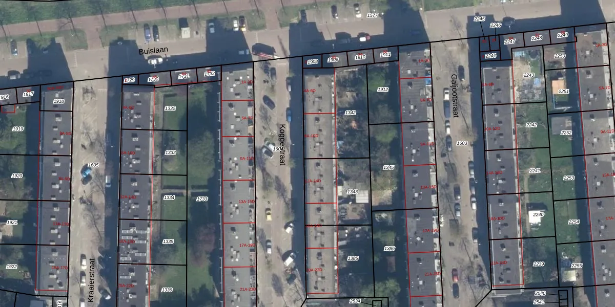 Het perceel waarop Koggestraat 10-C staat heeft een oppervlakte van 627 m². Dit is een groot perceel. De perceeloppervlakte wordt geregistreerd door het Kadaster. Gedetailleerde informatie over de maten van dit perceel kunt u vinden in het rapport Kadastrale kaart met maatvoering van Koggestraat 10-C.