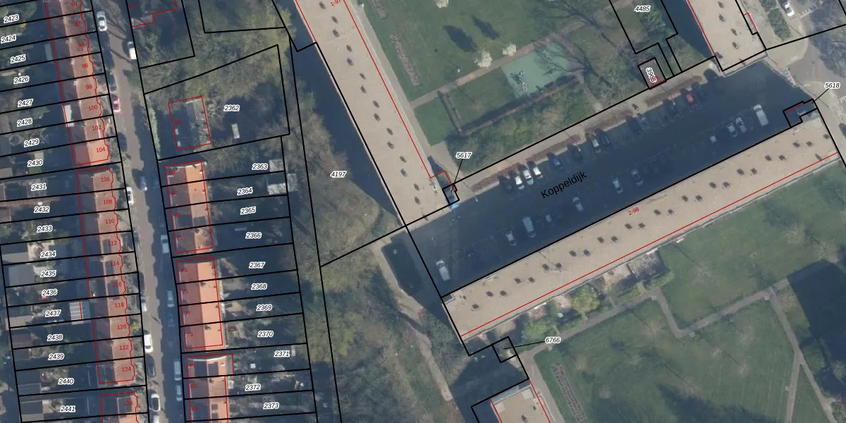 Het perceel waarop Koppeldijk 65 staat heeft een oppervlakte van 1,2 ha. Dit is een zeer groot perceel. De perceeloppervlakte wordt geregistreerd door het Kadaster. Gedetailleerde informatie over de maten van dit perceel kunt u vinden in het rapport Kadastrale kaart met maatvoering van Koppeldijk 65.