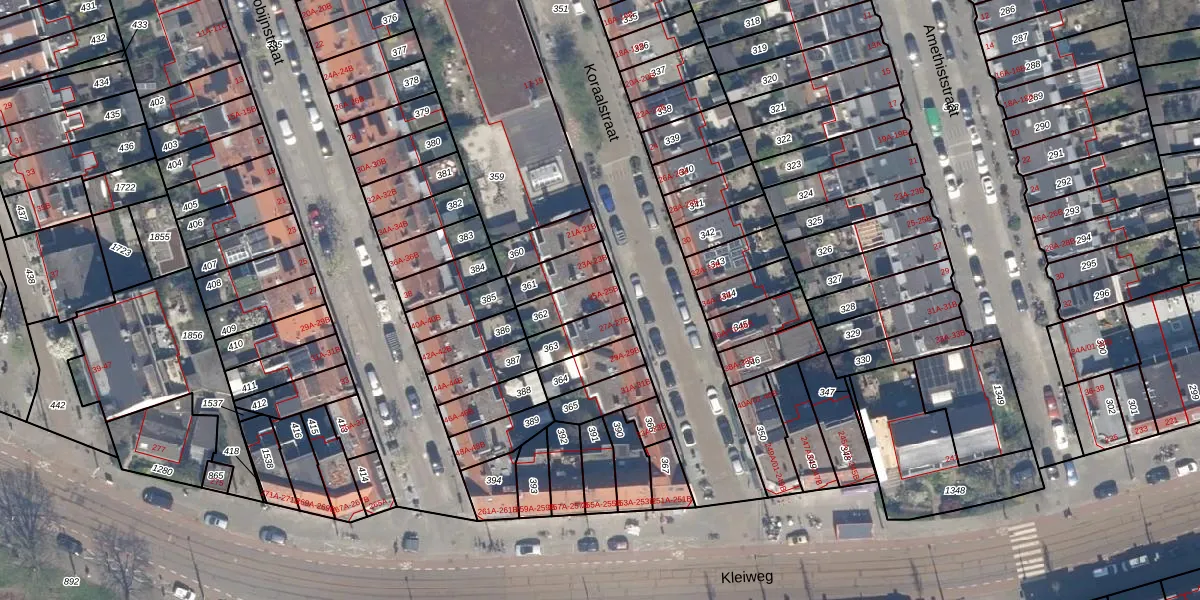 Het perceel waarop Koraalstraat 25-A staat heeft een oppervlakte van 96 m². Dit is een klein perceel. De perceeloppervlakte wordt geregistreerd door het Kadaster. Gedetailleerde informatie over de maten van dit perceel kunt u vinden in het rapport Kadastrale kaart met maatvoering van Koraalstraat 25-A.
