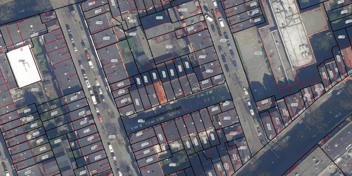 Korenaardwarsstraat 19 is gelegen op kadastraal perceel DHV00F1732. Deze kadastrale aanduiding is uniek en wordt gebruikt door het Kadaster om eigendomsrechten en andere zakelijke rechten vast te leggen. Het perceel maakt onderdeel uit van de kadastrale gemeente Delfshaven.