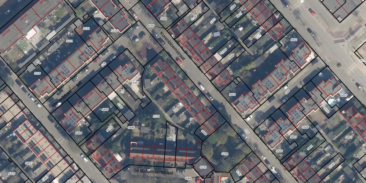 Korenbloemstraat 21 is gelegen op kadastraal perceel CLS00G5774. Deze kadastrale aanduiding is uniek en wordt gebruikt door het Kadaster om eigendomsrechten en andere zakelijke rechten vast te leggen. Het perceel maakt onderdeel uit van de kadastrale gemeente Charlois.
