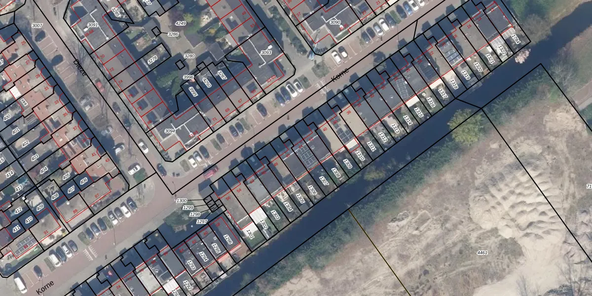 Het perceel waarop Korne 44 staat heeft een oppervlakte van 129 m². Dit is een middelgroot perceel. De perceeloppervlakte wordt geregistreerd door het Kadaster. Gedetailleerde informatie over de maten van dit perceel kunt u vinden in het rapport Kadastrale kaart met maatvoering van Korne 44.