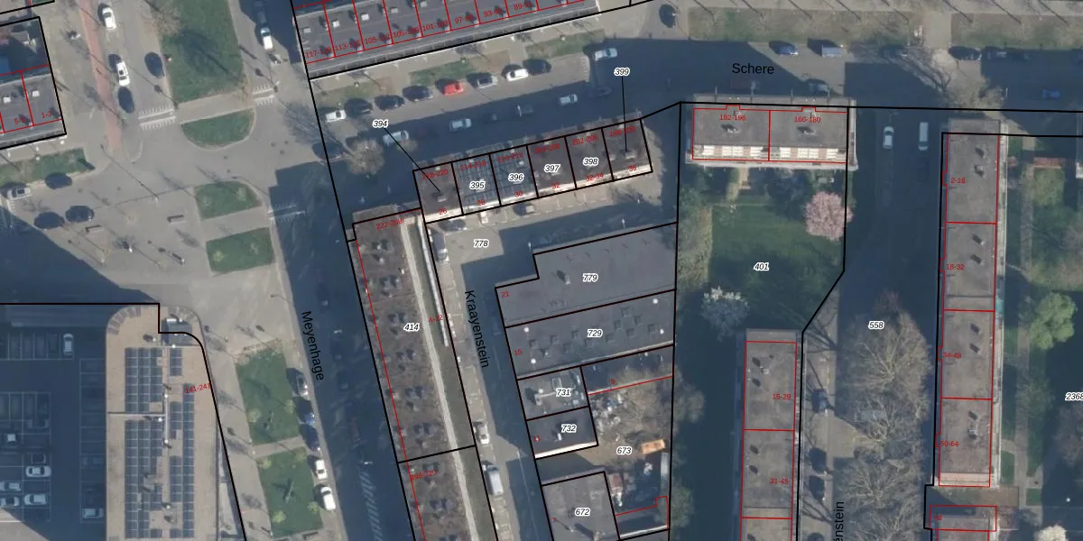 Gebruik de zoekbalk of klik op een perceel voor informatie over de adressen binnen dit perceel.