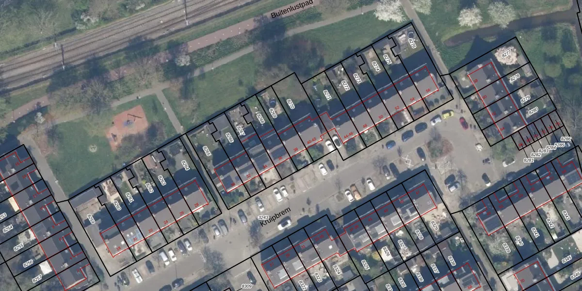 Het perceel waarop Kruipbrem 38 staat heeft een oppervlakte van 187 m². Dit is een middelgroot perceel. De perceeloppervlakte wordt geregistreerd door het Kadaster. Gedetailleerde informatie over de maten van dit perceel kunt u vinden in het rapport Kadastrale kaart met maatvoering van Kruipbrem 38.