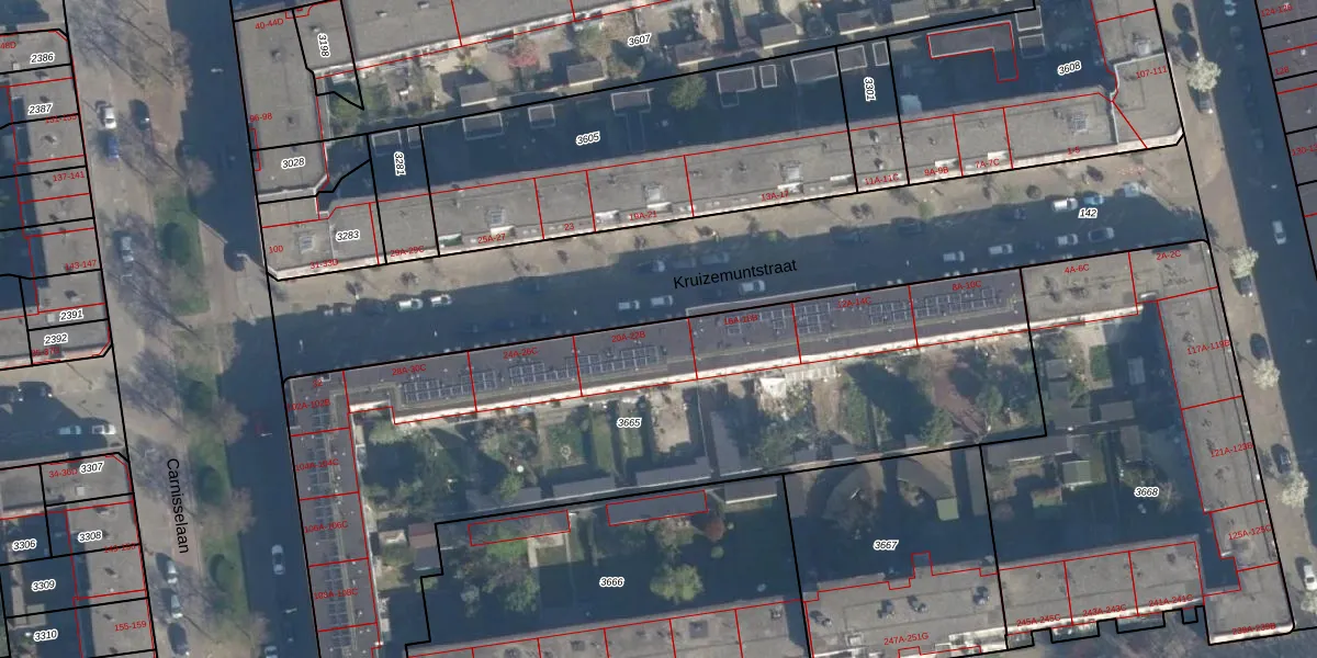 Kruizemuntstraat 20-A is gelegen op kadastraal perceel CLS00H3665. Deze kadastrale aanduiding is uniek en wordt gebruikt door het Kadaster om eigendomsrechten en andere zakelijke rechten vast te leggen. Het perceel maakt onderdeel uit van de kadastrale gemeente Charlois.