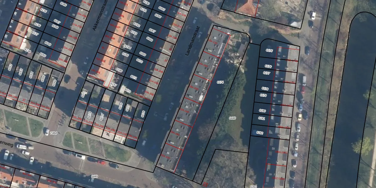 Het perceel waarop Landmanstraat 20-A staat heeft een oppervlakte van 1734 m². Dit is een zeer groot perceel. De perceeloppervlakte wordt geregistreerd door het Kadaster. Gedetailleerde informatie over de maten van dit perceel kunt u vinden in het rapport Kadastrale kaart met maatvoering van Landmanstraat 20-A.