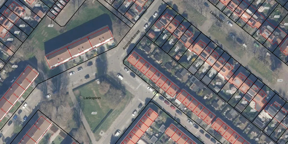Het perceel waarop Lariksplein 12 staat heeft een oppervlakte van 4498 m². Dit is een zeer groot perceel. De perceeloppervlakte wordt geregistreerd door het Kadaster. Gedetailleerde informatie over de maten van dit perceel kunt u vinden in het rapport Kadastrale kaart met maatvoering van Lariksplein 12.