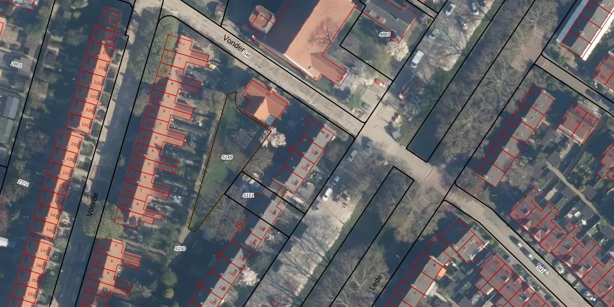 Het perceel waarop Lede 127 staat heeft een oppervlakte van 6445 m². Dit is een zeer groot perceel. De perceeloppervlakte wordt geregistreerd door het Kadaster. Gedetailleerde informatie over de maten van dit perceel kunt u vinden in het rapport Kadastrale kaart met maatvoering van Lede 127.