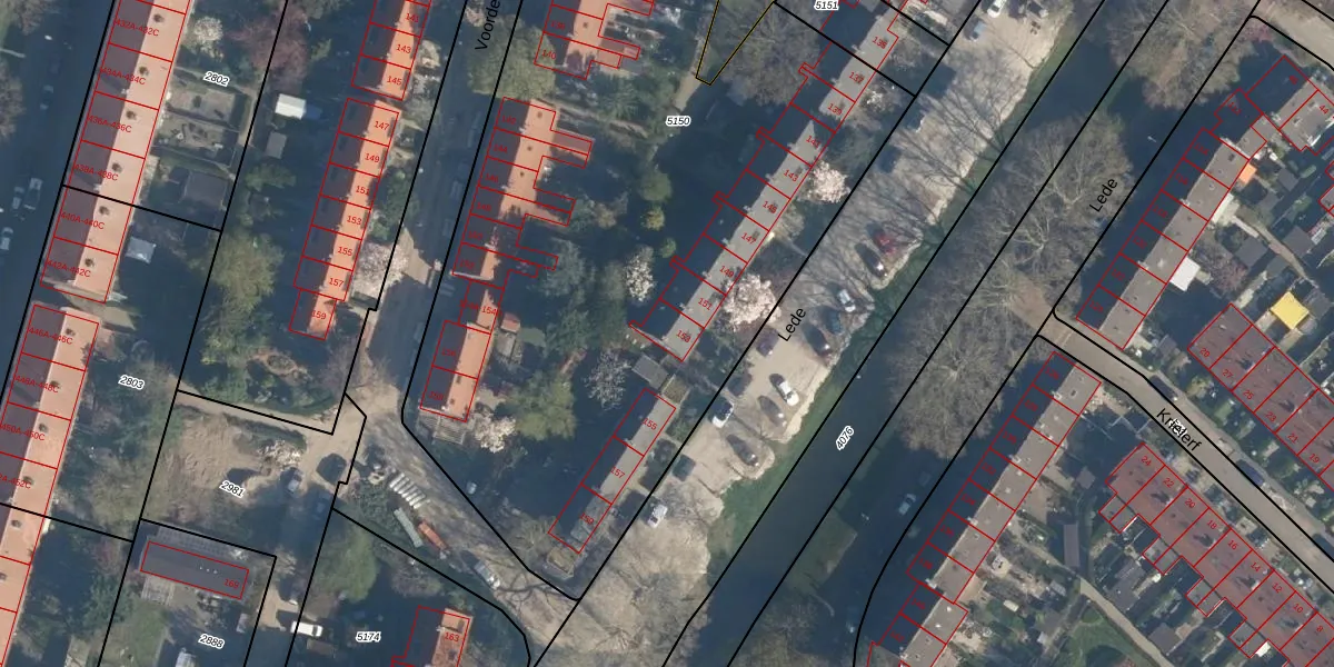 Het perceel waarop Lede 153 staat heeft een oppervlakte van 6445 m². Dit is een zeer groot perceel. De perceeloppervlakte wordt geregistreerd door het Kadaster. Gedetailleerde informatie over de maten van dit perceel kunt u vinden in het rapport Kadastrale kaart met maatvoering van Lede 153.