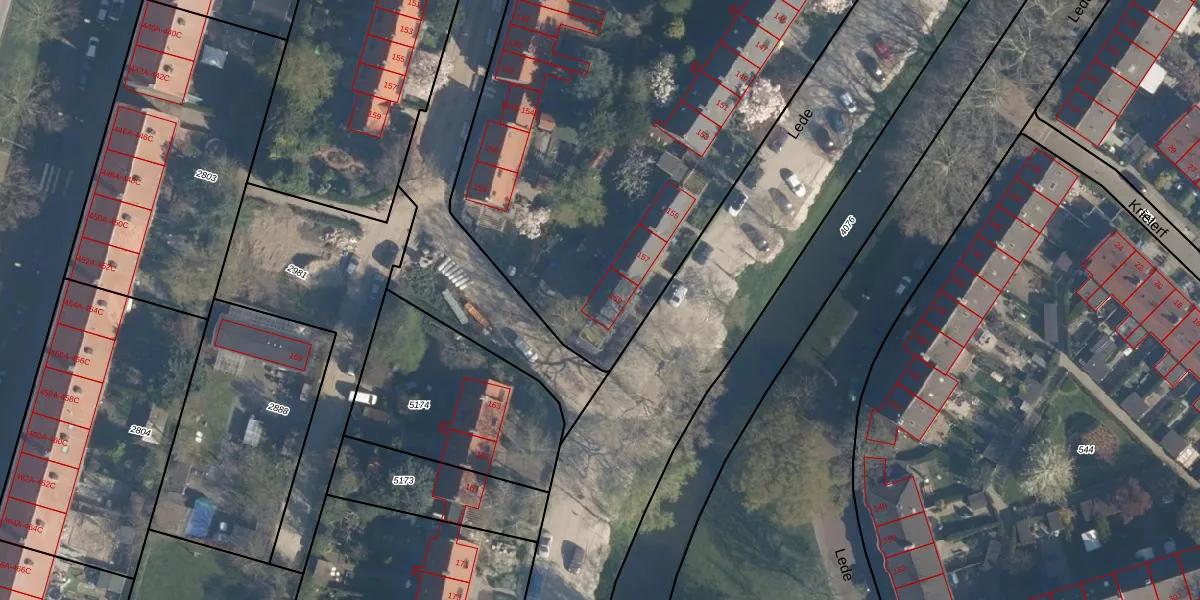Het perceel waarop Lede 159 staat heeft een oppervlakte van 6445 m². Dit is een zeer groot perceel. De perceeloppervlakte wordt geregistreerd door het Kadaster. Gedetailleerde informatie over de maten van dit perceel kunt u vinden in het rapport Kadastrale kaart met maatvoering van Lede 159.