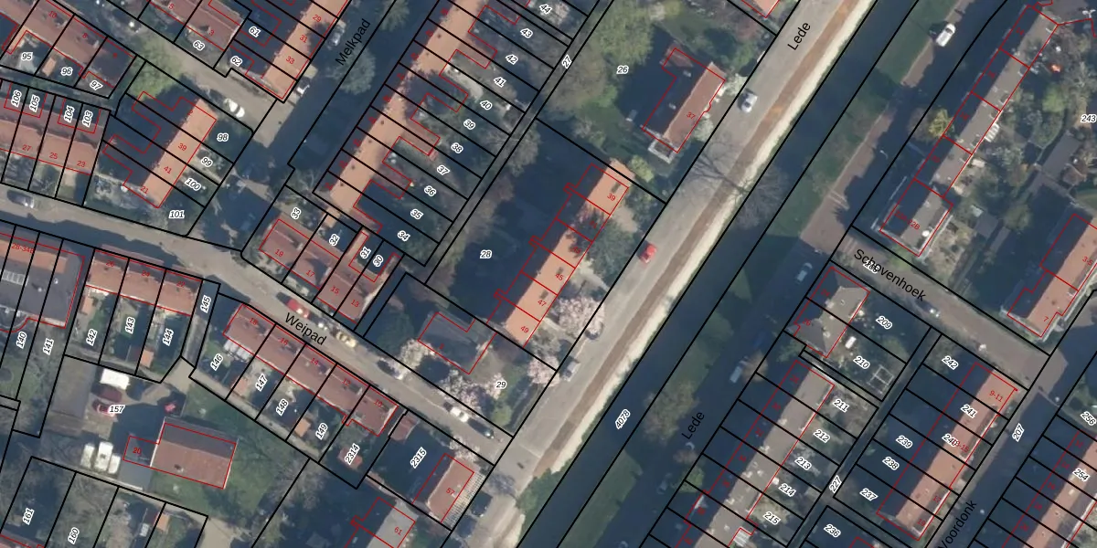 Het perceel waarop Lede 45 staat heeft een oppervlakte van 1050 m². Dit is een zeer groot perceel. De perceeloppervlakte wordt geregistreerd door het Kadaster. Gedetailleerde informatie over de maten van dit perceel kunt u vinden in het rapport Kadastrale kaart met maatvoering van Lede 45.
