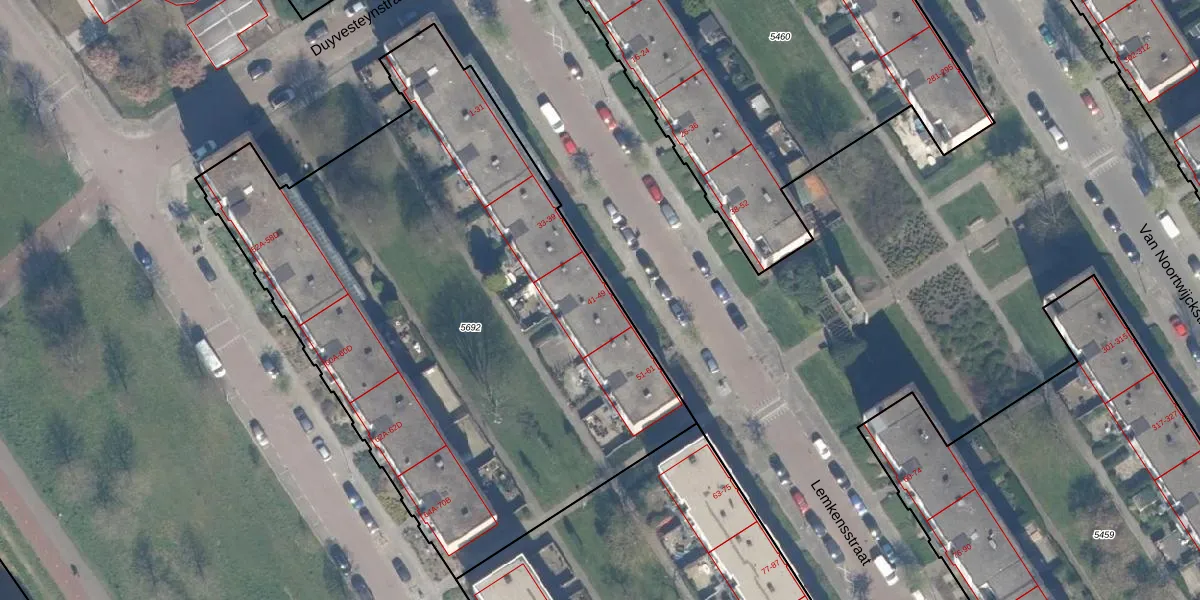 Lemkensstraat 45 is gelegen op kadastraal perceel OVS00C5692. Deze kadastrale aanduiding is uniek en wordt gebruikt door het Kadaster om eigendomsrechten en andere zakelijke rechten vast te leggen. Het perceel maakt onderdeel uit van de kadastrale gemeente Overschie.