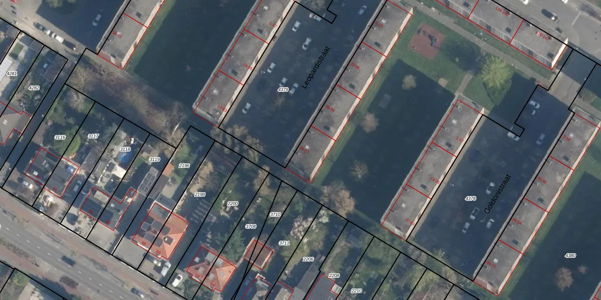 Het perceel waarop Leopardistraat 66 staat heeft een oppervlakte van 1,9 ha. Dit is een zeer groot perceel. De perceeloppervlakte wordt geregistreerd door het Kadaster. Gedetailleerde informatie over de maten van dit perceel kunt u vinden in het rapport Kadastrale kaart met maatvoering van Leopardistraat 66.