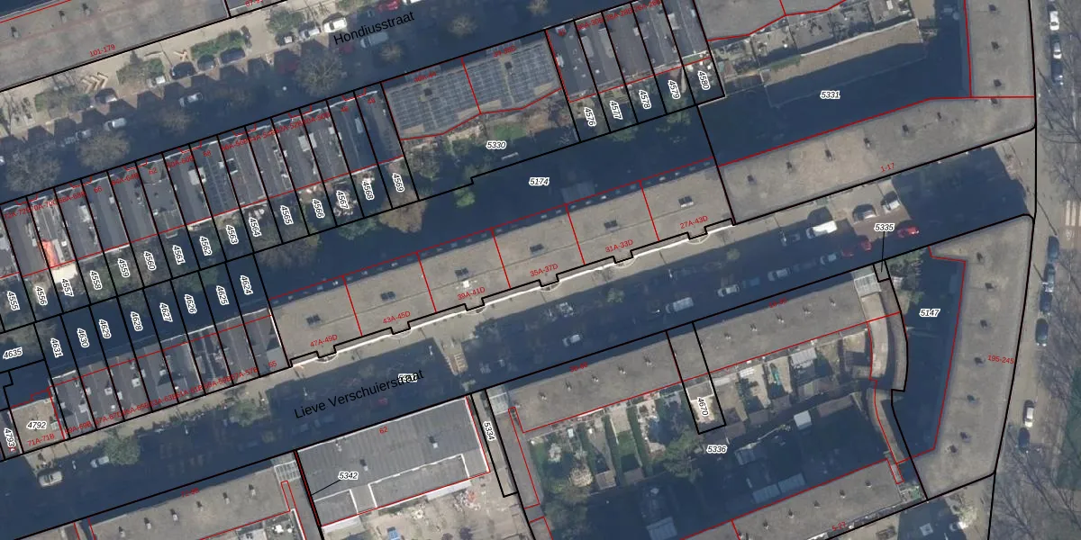 Lieve Verschuierstraat 37-D is gelegen op kadastraal perceel DHV00C5174. Deze kadastrale aanduiding is uniek en wordt gebruikt door het Kadaster om eigendomsrechten en andere zakelijke rechten vast te leggen. Het perceel maakt onderdeel uit van de kadastrale gemeente Delfshaven.