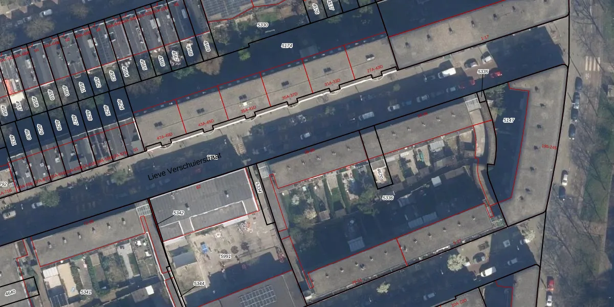 Lieve Verschuierstraat 44 is gelegen op kadastraal perceel DHV00C5336. Deze kadastrale aanduiding is uniek en wordt gebruikt door het Kadaster om eigendomsrechten en andere zakelijke rechten vast te leggen. Het perceel maakt onderdeel uit van de kadastrale gemeente Delfshaven.