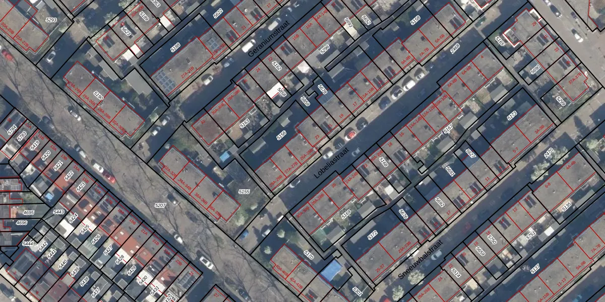 Lobeliastraat 25-A is gelegen op kadastraal perceel CLS00G5156. Deze kadastrale aanduiding is uniek en wordt gebruikt door het Kadaster om eigendomsrechten en andere zakelijke rechten vast te leggen. Het perceel maakt onderdeel uit van de kadastrale gemeente Charlois.