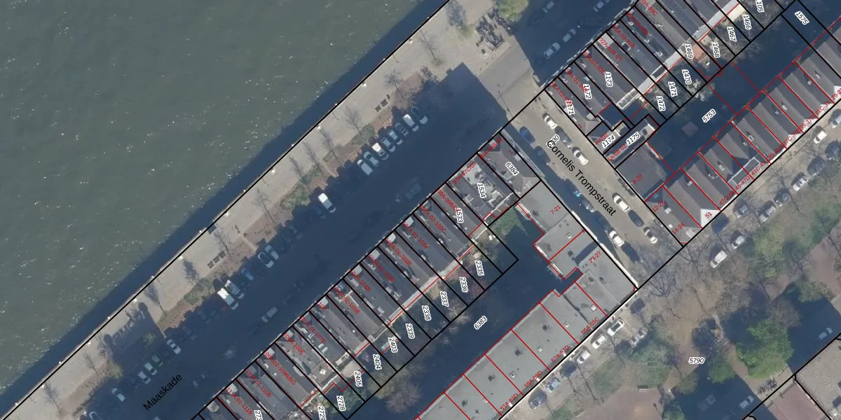 Maaskade 100-B is gelegen op kadastraal perceel RTD05Q2335. Deze kadastrale aanduiding is uniek en wordt gebruikt door het Kadaster om eigendomsrechten en andere zakelijke rechten vast te leggen. Het perceel maakt onderdeel uit van de kadastrale gemeente Rotterdam.