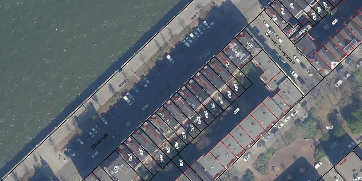 Maaskade 104-B is gelegen op kadastraal perceel RTD05Q2339. Deze kadastrale aanduiding is uniek en wordt gebruikt door het Kadaster om eigendomsrechten en andere zakelijke rechten vast te leggen. Het perceel maakt onderdeel uit van de kadastrale gemeente Rotterdam.