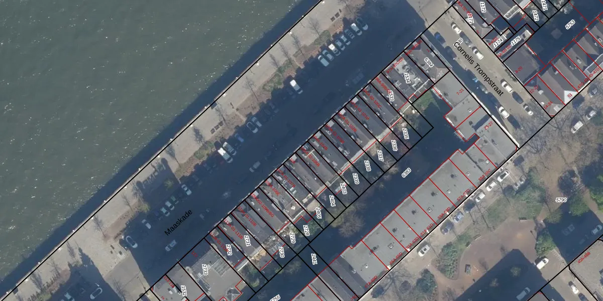 Maaskade 105-A-02 is gelegen op kadastraal perceel RTD05Q2403. Deze kadastrale aanduiding is uniek en wordt gebruikt door het Kadaster om eigendomsrechten en andere zakelijke rechten vast te leggen. Het perceel maakt onderdeel uit van de kadastrale gemeente Rotterdam.