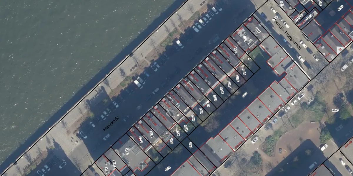 Maaskade 106 is gelegen op kadastraal perceel RTD05Q2404. Deze kadastrale aanduiding is uniek en wordt gebruikt door het Kadaster om eigendomsrechten en andere zakelijke rechten vast te leggen. Het perceel maakt onderdeel uit van de kadastrale gemeente Rotterdam.
