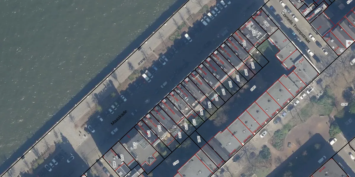 Maaskade 107-A-03 is gelegen op kadastraal perceel RTD05Q2405. Deze kadastrale aanduiding is uniek en wordt gebruikt door het Kadaster om eigendomsrechten en andere zakelijke rechten vast te leggen. Het perceel maakt onderdeel uit van de kadastrale gemeente Rotterdam.