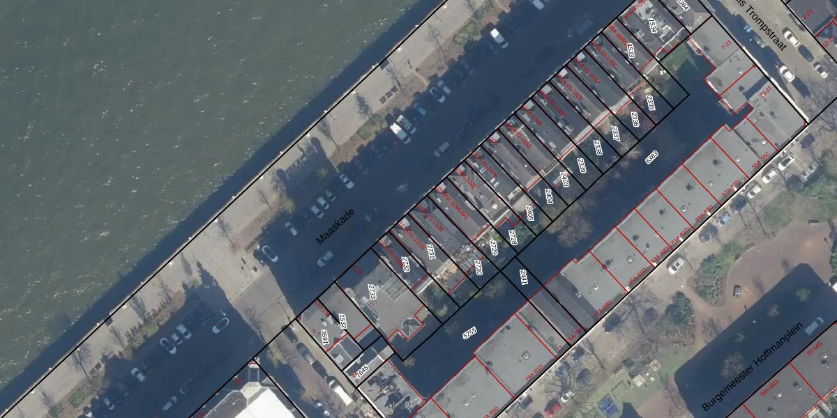 Maaskade 110-B is gelegen op kadastraal perceel RTD05Q2730. Deze kadastrale aanduiding is uniek en wordt gebruikt door het Kadaster om eigendomsrechten en andere zakelijke rechten vast te leggen. Het perceel maakt onderdeel uit van de kadastrale gemeente Rotterdam.