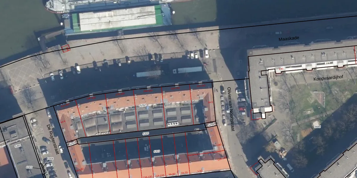 Maaskade 23-B is gelegen op kadastraal perceel RTD05Q5292. Deze kadastrale aanduiding is uniek en wordt gebruikt door het Kadaster om eigendomsrechten en andere zakelijke rechten vast te leggen. Het perceel maakt onderdeel uit van de kadastrale gemeente Rotterdam.