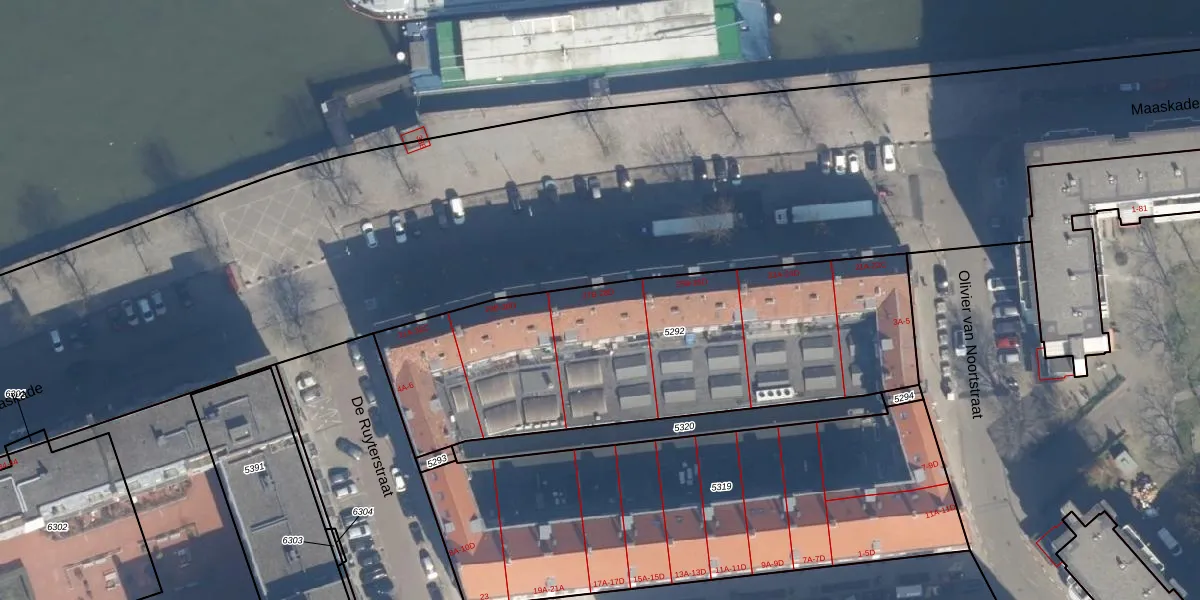 Maaskade 27-D is gelegen op kadastraal perceel RTD05Q5292. Deze kadastrale aanduiding is uniek en wordt gebruikt door het Kadaster om eigendomsrechten en andere zakelijke rechten vast te leggen. Het perceel maakt onderdeel uit van de kadastrale gemeente Rotterdam.