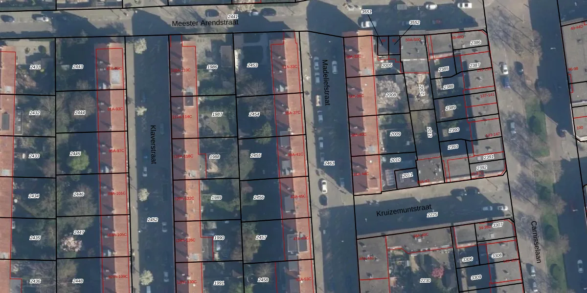 Madeliefstraat 39-A is gelegen op kadastraal perceel CLS00H2455. Deze kadastrale aanduiding is uniek en wordt gebruikt door het Kadaster om eigendomsrechten en andere zakelijke rechten vast te leggen. Het perceel maakt onderdeel uit van de kadastrale gemeente Charlois.