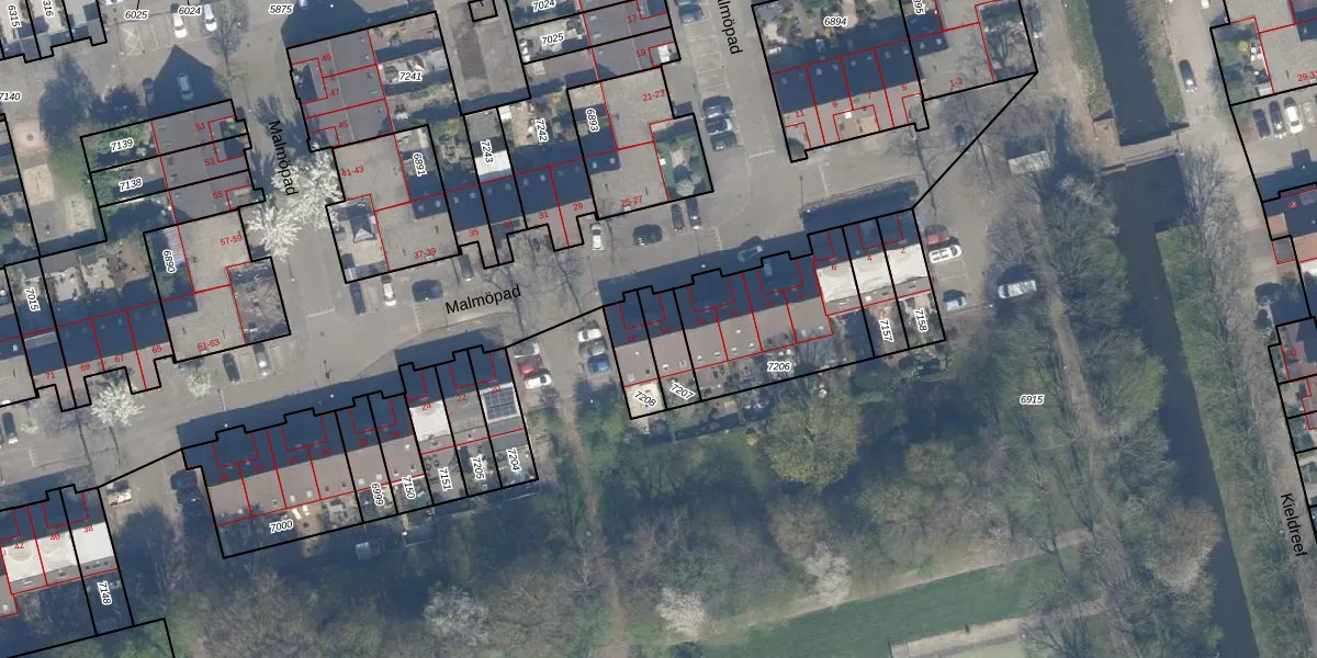 Het perceel waarop Malmöpad 16 staat heeft een oppervlakte van 98 m². Dit is een klein perceel. De perceeloppervlakte wordt geregistreerd door het Kadaster. Gedetailleerde informatie over de maten van dit perceel kunt u vinden in het rapport Kadastrale kaart met maatvoering van Malmöpad 16.